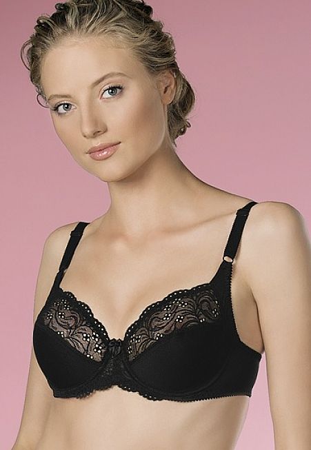 Бюстгальтер из неэластичного и эластичного трикотажного полотна и эластичного кружева. На каркасах. Мягкие чашки с двойным членением и боковой корректирующей деталью. Отделка - бантик.