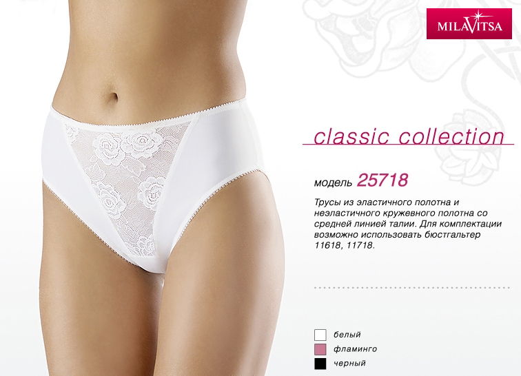 Трусы слип из эластичного трикотажного полотна и неэластичного кружевного полотна. Передняя деталь на подкладке из эластичного трикотажного полотна. Средняя линия талии