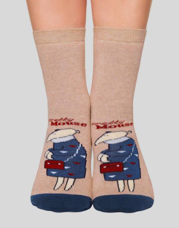 Комфортные теплые махровые женские носки из хлопка, без вывязанной пятки, на стопе антискользящее покрытие. С рисунками "