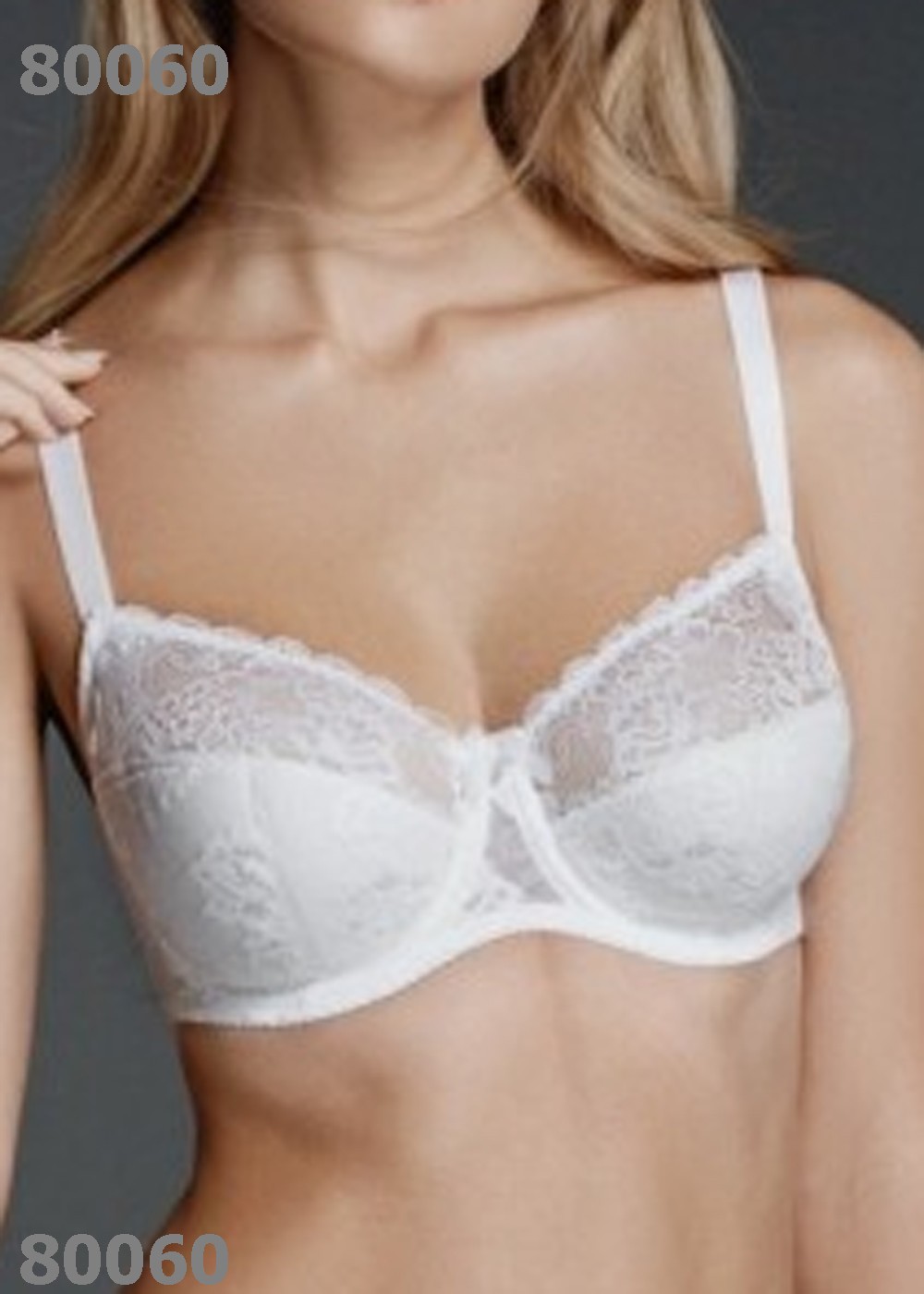Бюстгальтер из неэластичного кружева, неэластичного кружевного и эластичного трикотажного полотна. На каркасах. Нижние детали чашек на дубляже с хлопком. Упругие пластины в боковых деталях стана. Декоративные бретели с раздвоенным участком.