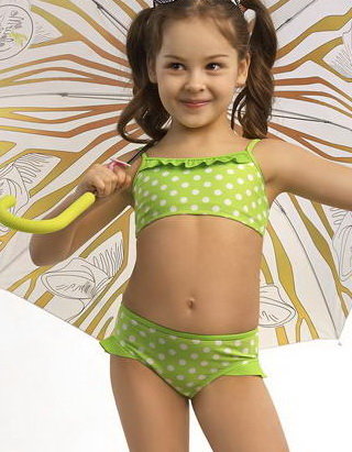 Купальный костюм для девочки из набивного трикотажного полотна в горошек . Укороченный топ с декоративной рюшей в области груди. Перед изделия на подкладке. Бретели топа - не съемные, регулируемые. Плавки - бикини с двойной ластовицей и декоративными рюшами из однотонного трикотажного полотна по ножкам в области бедер.