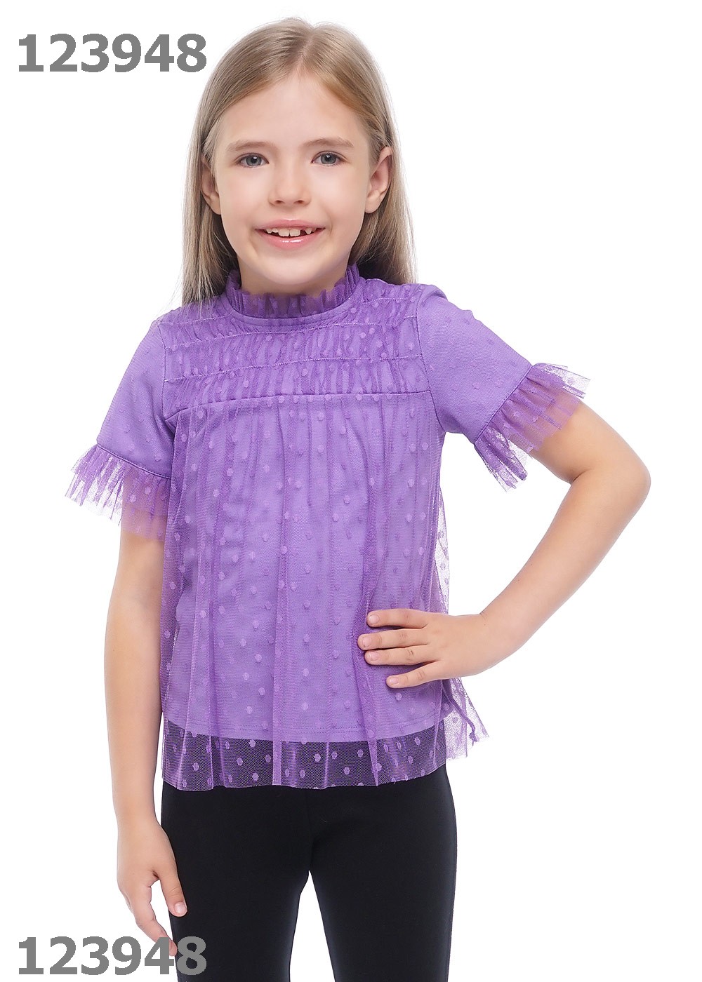 Очаровательный джемпер из сетки в горошек с хлопковым подкладом. Расширенный к низу силуэт идет от кокетки со сборкой.Горловина со стойкой и рюшей по краю. рукав с двойной оборкой по низу.На спинке капля с пуговицей