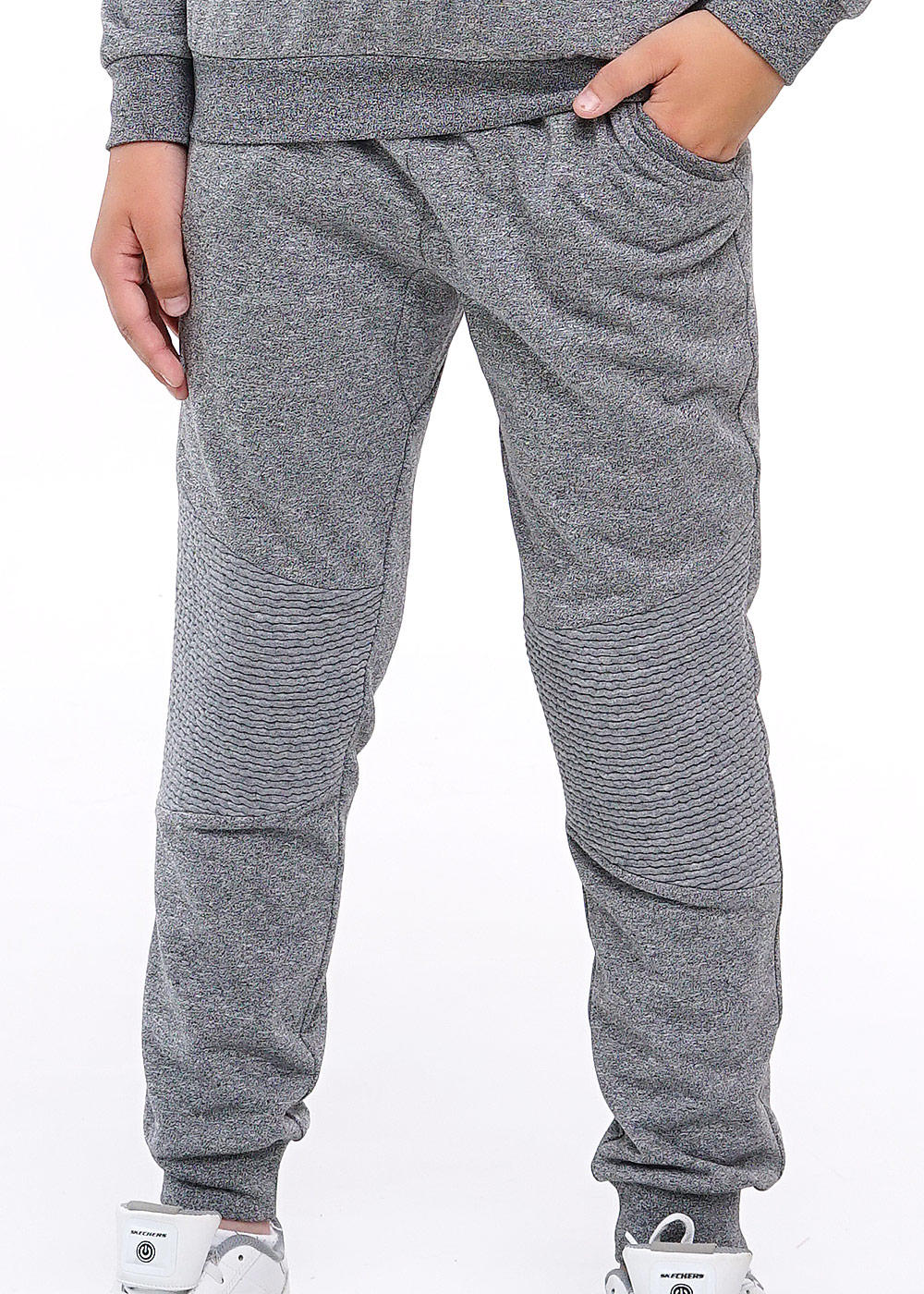 Брюки из футера с фактурой микшированный меланж в сочетании с диоганальными вставками на коленях из капитония. Пояс с эластичной тесьмой, регулируется шнуром. По силуэту слегка зауженные к низу, на манжете. Карманы боковые, средний шов с ластовицей.