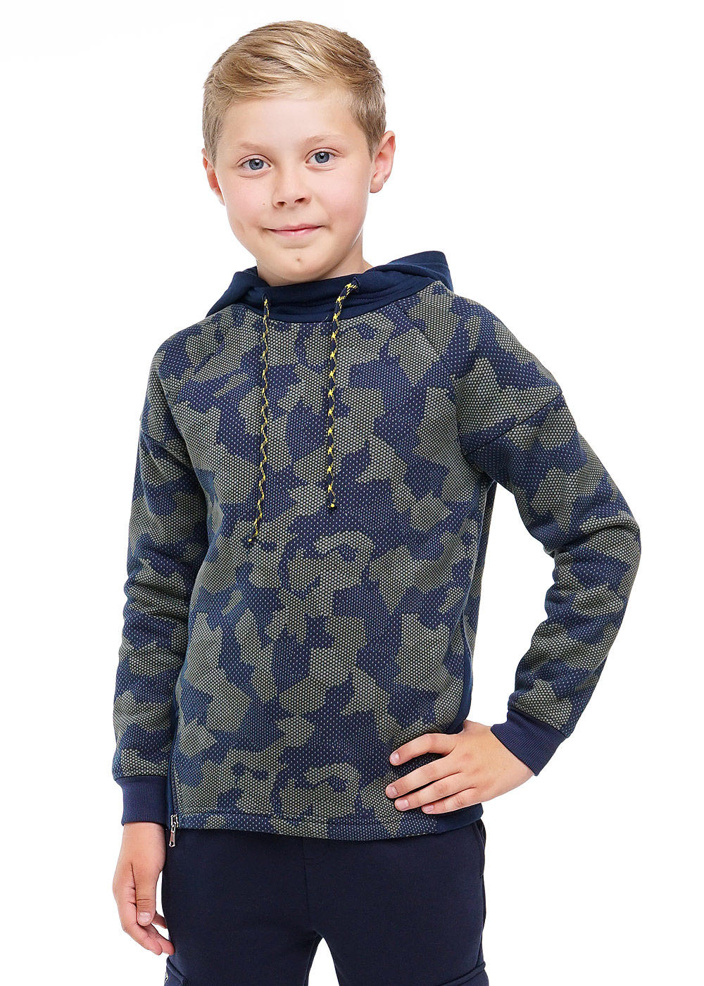 актуальный худи из плотного футера.капюшон со стойкой регулируется шнуром. рукав реглан с резом на уровне плеча.по низу рукава эластичный манжет.впереди отрезные бочки из отделочного полотна в цвет капюшона.В правом бочке-молния.На рукаве шрифтовой п