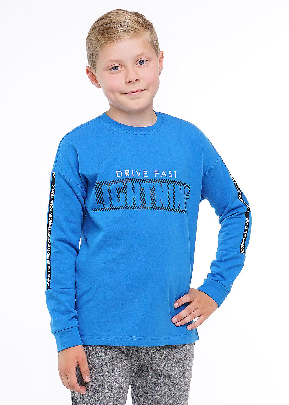 Джемпер на хлопке, трендовый спущенный рукав отделан тесьмой с тейпом. Спинка удлиненная, по бокам разрезы. Украшена модель принтом.