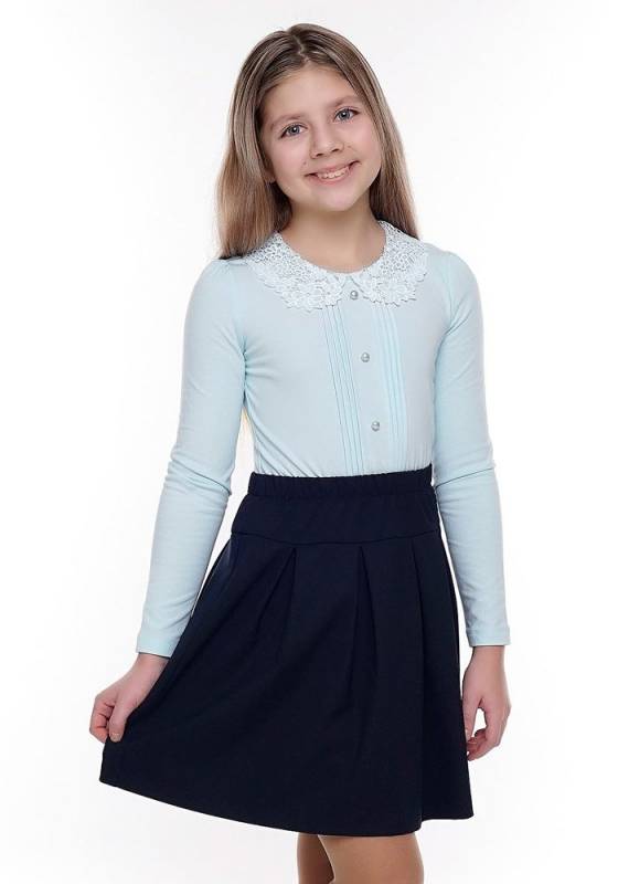 Нарядный джемпер из эластичного хлопка с кружевным отложным воротничком. Модель приталенного силуэта, впереди оформлена защипами, сзади застежка на пуговицу.