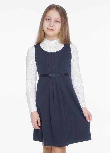 Удобный сарафан из джерси расклешенного к низу силуэта. Перед оформлен рядом складок на лифе, которые заканчиваются элегантной лентой чуть выше талии, завязанной сзади на бант, регулируя объем.