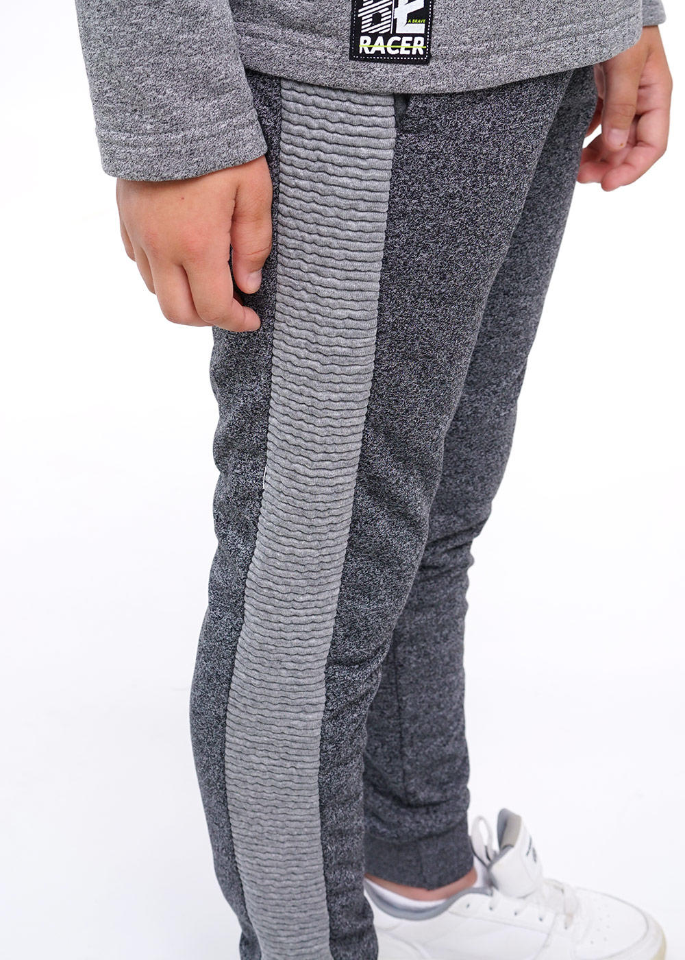 Комфортные брюки из футера с фактурой микшированный меланж в сочетании с широким лампасом из капитония. Пояс прострочен с эластичной тесьмой, регулируется шнуром. По силуэту слегка зауженные к низу,на манжете. Карманы в шве подреза переда.