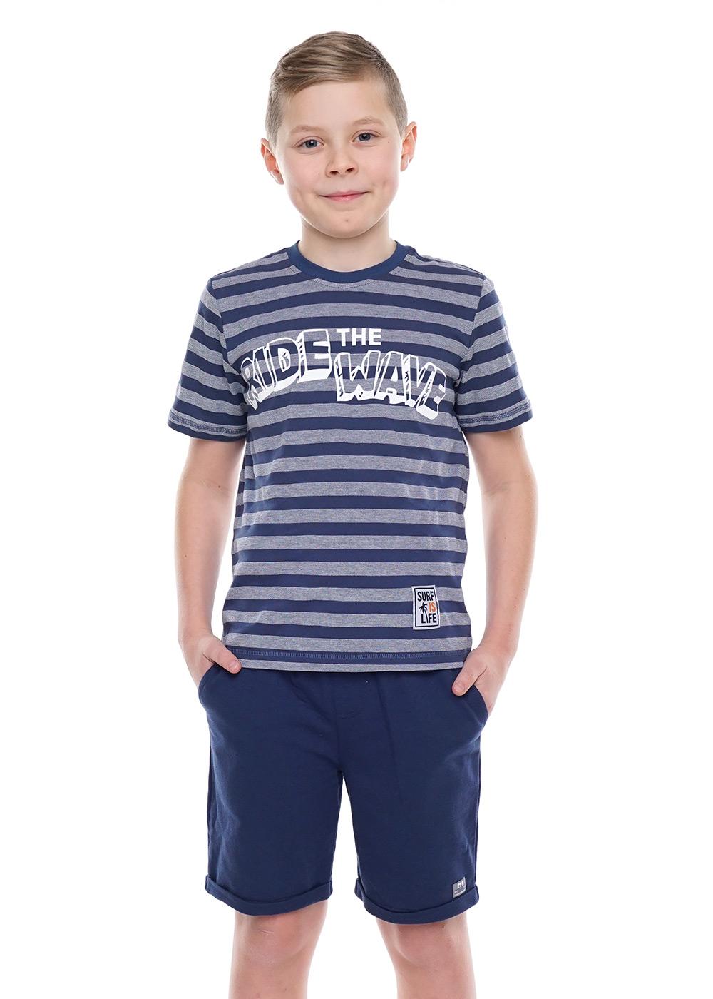 Базовая футболка с круглой горловиной. Выполнена из хлопка 100%. Украшена модель ярким принтом и жаккардовой нашивкой.