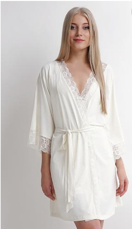 Легкий, струящийся халат выполнен из эластичного плотна с рисунком ""точка"". Края изделия по рукаву и запаху декорированы изящным кружевом.