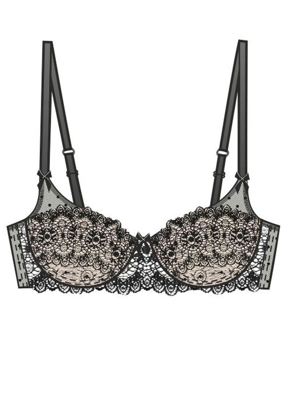 Бюстгальтер с формованной чашкой без push-up. Сочетание черного кружева и телесного цвета чашки создает эффект ""ню"". В изделии по задней части пояса и в декоративном ""ушке"" используется сетка с набивным горошком, что придает кокетливости образу.