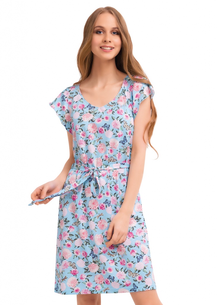 Платье из набивного полотна хлопок/модал прямого силуэта длиной выше колена V-образным вырезом горловины. Втачной рукав-крылышко обработан на узком оверлоке по краю. По талии узкий пояс.